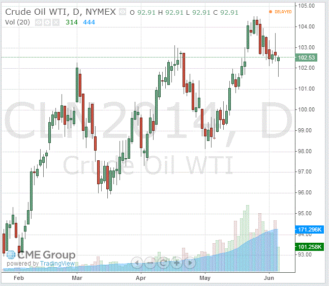 Стоимость июльских фьючерсов на американскую легкую нефть марки WTI (Light Sweet Crude Oil) снизилась до $102,52 за баррель на Нью-йоркской товарной бирже (NYMEX).