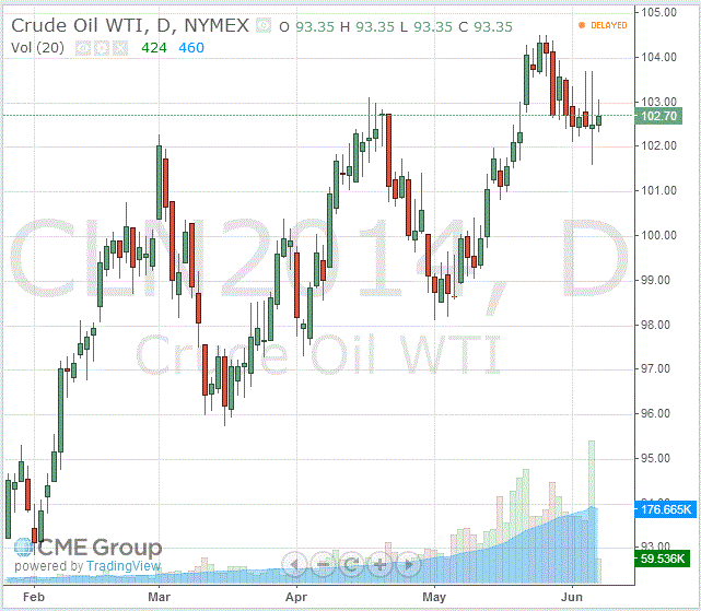 Стоимость июльских фьючерсов на американскую легкую нефть марки WTI (Light Sweet Crude Oil) выросла до $102,70 за баррель на Нью-йоркской товарной бирже (NYMEX).