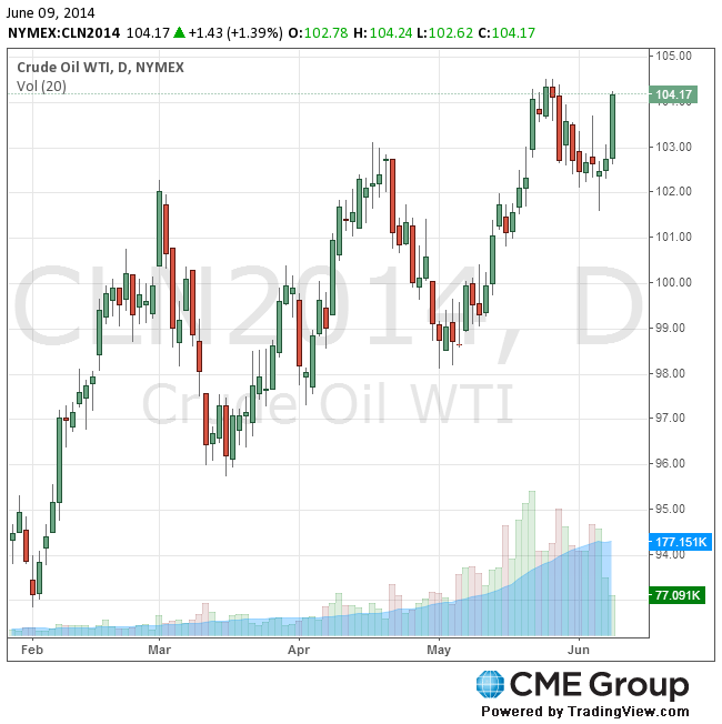Стоимость июльских фьючерсов на американскую легкую нефть марки WTI (Light Sweet Crude Oil) выросла до $104,24 за баррель на Нью-йоркской товарной бирже (NYMEX).