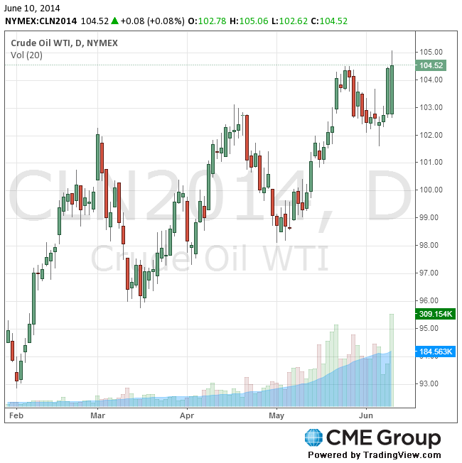 Стоимость июльских фьючерсов на американскую легкую нефть марки WTI (Light Sweet Crude Oil) выросла до $105,06 за баррель на Нью-йоркской товарной бирже (NYMEX).