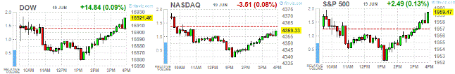 Фондовые индексы США закрылись разнонаправленно после того, как накануне индекс S&P обновил рекорд на заявлениях ФРС. Напомним, что по итогам заседания 17-18 июня Федеральный комитет по открытым рынкам американского ЦБ принял ожидаемое решение о снижении объема программы покупки активов на $10 млрд - до $35 млрд в месяц, сохранив целевой диапазон базовой процентной ставки от нуля до 0,25% годовых. При этом председатель ФРС Джанет Йеллен в ходе пресс-конференции по итогам заседания заявила, что ЦБ не будет повышать ставки в течение определенного периода после того, как будет свернута программа QE.