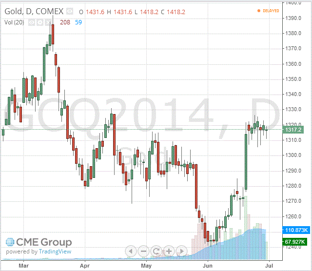 Стоимость августовского фьючерса на золото на COMEX сегодня снизилась до $1317.2 за унцию.