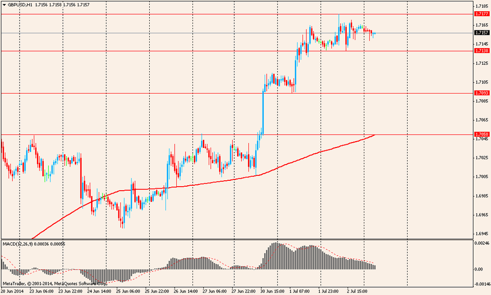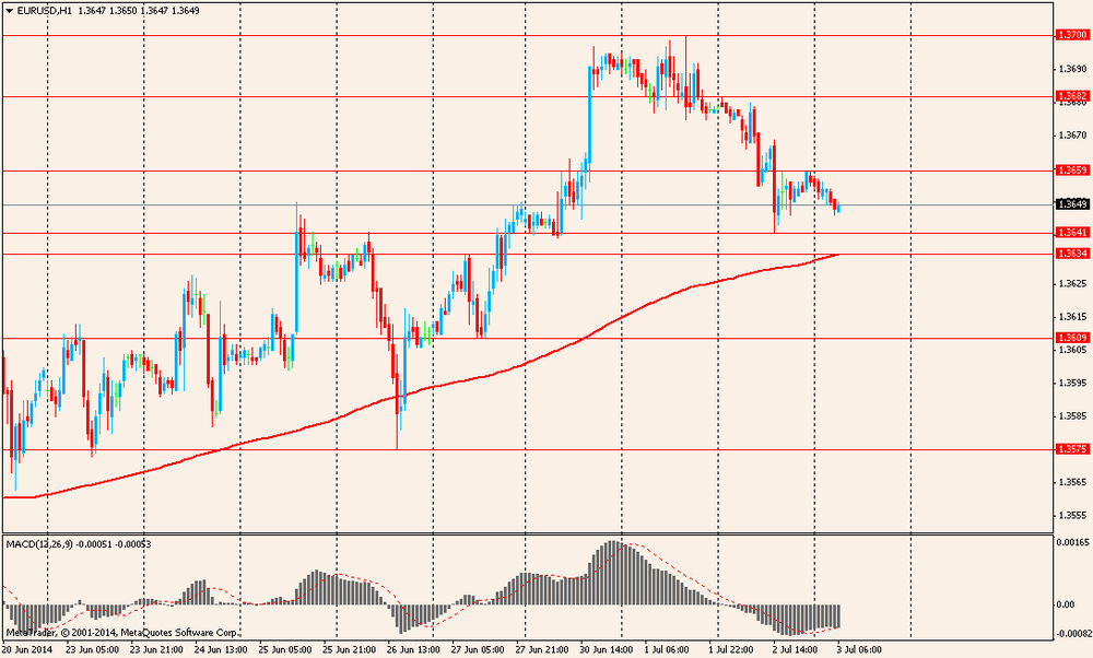 В 07:55 GMT в Германии, в 08:00 GMT в еврозоне и в 08:30 GMT в Британии выйдет индекс PMI для сферы услуг и композитный индекс PMI за июнь. В 09:00 GMT еврозона представит изменение объема розничной торговли за май. В 11:45 GMT состоится публикация решения ЕЦБ по основной процентной ставке, станет известна депозитная ставка ЕЦБ и ставка по кредитам. В 12:30 GMT пройдет ежемесячная пресс-конференция главы ЕЦБ. В Канаде и в США в 12:30 GMT выйдет сальдо баланса внешней торговли за май. США в 12:30 GMT представит уровень безработицы, изменение числа занятых в несельскохозяйственном секторе, изменение числа занятых в частном секторе экономики, изменение числа занятых в производственном секторе экономики, изменение средней почасовой оплаты труда, доля экономически активного населения, суммарный пересмотр занятости за 2 месяца за июнь, число первичных обращений за пособием по безработице, число повторных заявок на получение пособия по безработице, в 14:00 GMT - композитный индекс ISM для непроизводственной сферы, индекс занятости непроизводственного сектора от ISM за июнь.