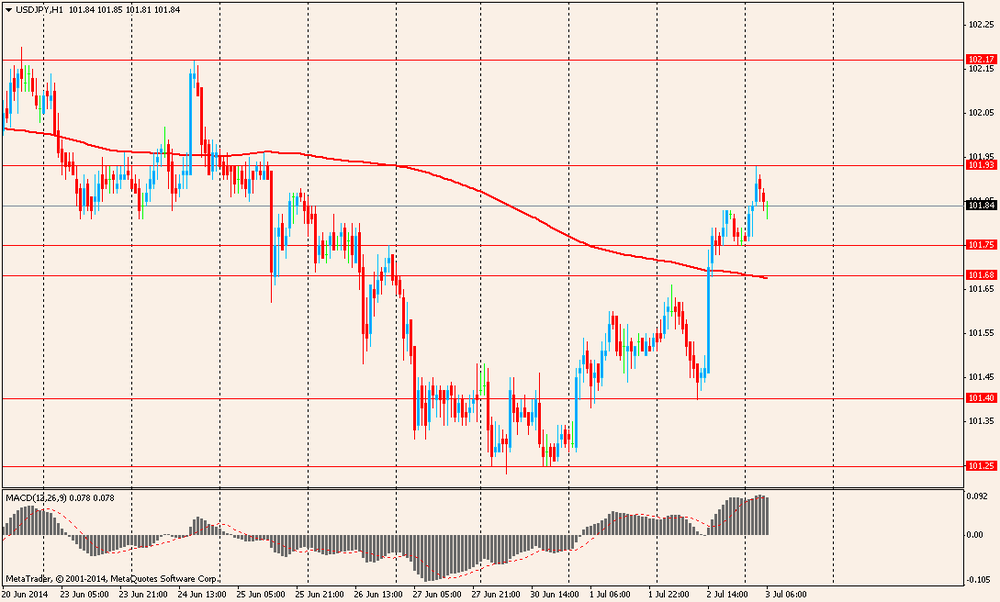 Доллар США растет против иены третий день подряд, после выхода позитивной статистики по рынку труда США. Вчера стало известно, что в июне найм в частном секторе США вырос, т.к. работодатели создали 281 тыс рабочих мест, сообщает Automatic Data Processing Inc. Экономисты полагали, что в июне в частном секторе было создано 206 тысяч рабочих мест, по сравнению с 179 тысячами, добавленными в мае. Помимо этого, сегодня будет опубликован официальный отчет по безработице и количеству новых созданных рабочих мест от Министерства труда США. Аналитики ожидают прироста последнего показателя к 211 тыс рабочих мест, тогда как в мае было принято на работу 217 тыс. работников.
