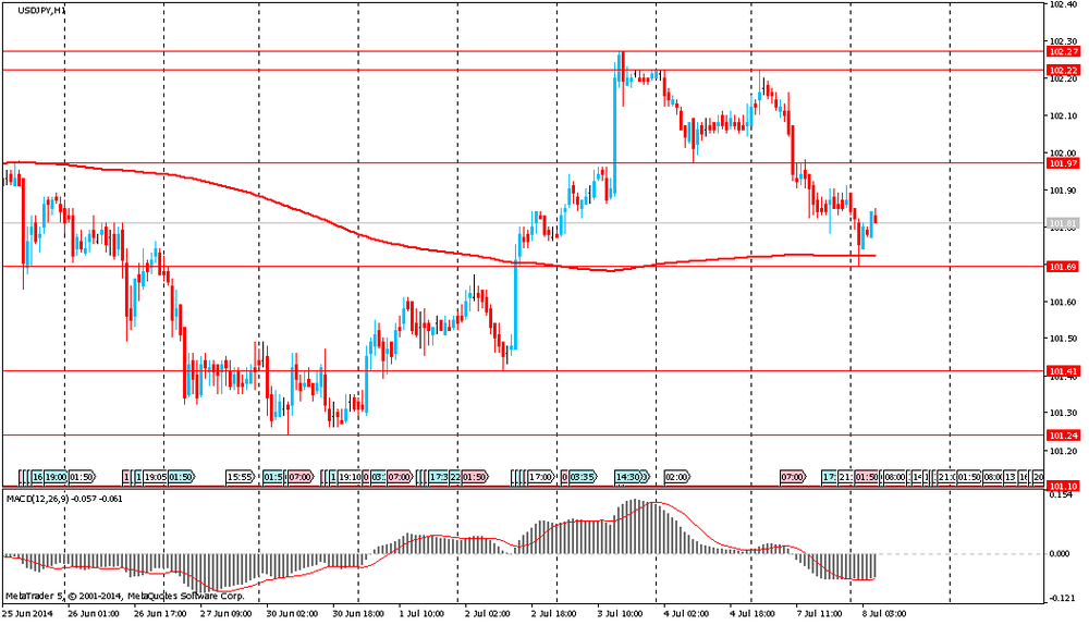 Иена со вчерашнего дня продолжает расти на фоне снижения фьючерсов на американские фондовые индексы и после публикации данных по текущему платежному балансу Японии. Общий профицит показателя составил 522,8 млрд. иен (5,1 млрд. долларов). Согласно среднему прогнозу экономистов, профицит текущего счета должен был составить 417,5 млрд. иен. Импорт сократился впервые за 19 месяцев, так как потребители урезали расходы после увеличения налога с продаж в апреле, в то время как экспорт остался вялым, подчеркивая, что производители не могут рассчитывать на поддержку в виде падения иены по отношению к доллару.