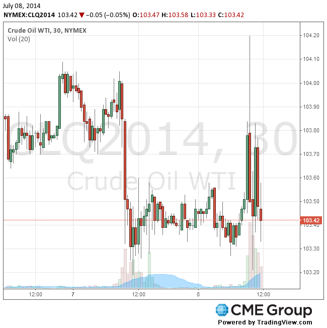 Стоимость августовских фьючерсов на американскую легкую нефть марки WTI (Light Sweet Crude Oil) снизилась до $103,42 за баррель (-0,07%) на Нью-йоркской товарной бирже (NYMEX).
