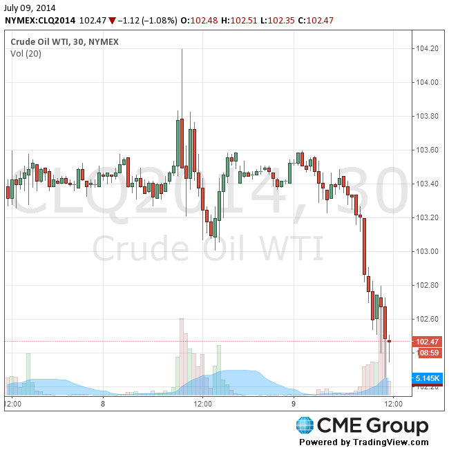 Стоимость августовских фьючерсов на американскую легкую нефть марки WTI (Light Sweet Crude Oil) снизилась до $102,47 за баррель (-1,04%) на Нью-йоркской товарной бирже (NYMEX).