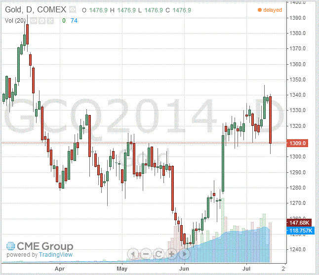 Цены на золото резко снизились сегодня, потеряв при этом более чем 2 процента в связи с угасанием опасений в отношении крупнейшего публичного банка Португалии Banco Espirito Santo. Аналитики также отмечают, что причиной падения также был тот факт, что некоторые трейдеры считали рост цен до уровня четырехмесячного максимума чрезмерным и желали получить внятное представление, когда американские политики могут начать повышение процентных ставок. На этой неделе инвесторы ждут выступлений в Конгрессе председателя ФРС Джанет Йеллен, дабы получить свежие намеки на будущее направление денежно-кредитной политики. Напомним, на прошлой неделе протокол июньского заседания ФРС дал слабые представления о том, когда могут начать расти ставки.