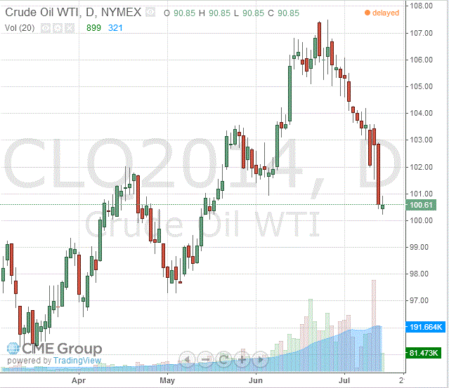 Стоимость августовских фьючерсов на американскую легкую нефть марки WTI (Light Sweet Crude Oil) снизилась до $100,63 за баррель на Нью-йоркской товарной бирже (NYMEX).