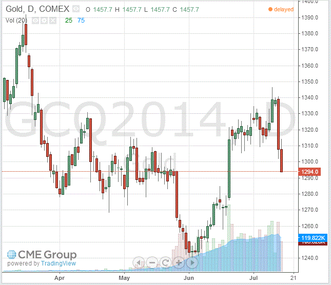 Стоимость августовского фьючерса на золото на COMEX сегодня снизилась до $1294.00 за унцию.