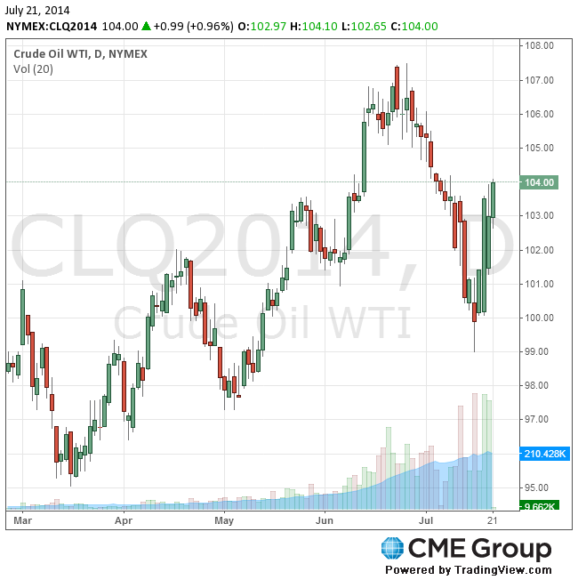 Стоимость августовских фьючерсов на американскую легкую нефть марки WTI (Light Sweet Crude Oil) выросла до $104,10 за баррель на Нью-йоркской товарной бирже (NYMEX).