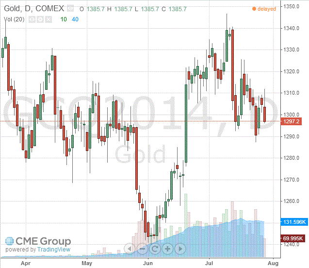 Стоимость августовского фьючерса на золото на COMEX сегодня упала на $6.2 - до $1297.20 за унцию.