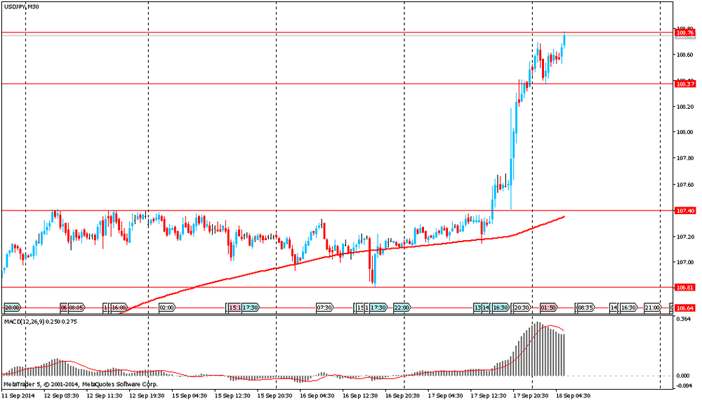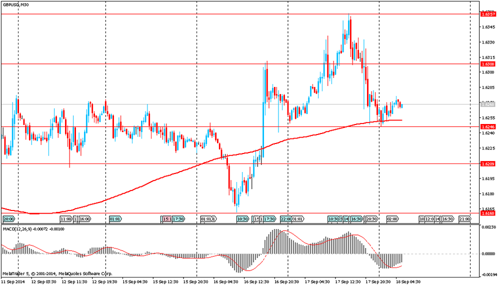 Сегодня пройдет референдум по вопросу независимости Шотландии. Также в этот день будут обнародованы итоги заседания Швейцарского национального банка (07:30 GMT). Кроме того, в четверг будут запущен первый этап программы целевого долгосрочного кредитования (TLTRO) ЕЦБ. Среди других событий четверга стоит отметить выступление главы Банка Японии Харухико Куроды в 06:35 GMT, статистику по розничным продажам в Великобритании (08:30 GMT), данные по рынку жилья США (12:30 GMT, разрешения на строительство, закладки новых домов) и выступление председателя ФРС Джанет Йеллен в 12:45 GMT.