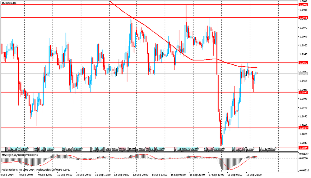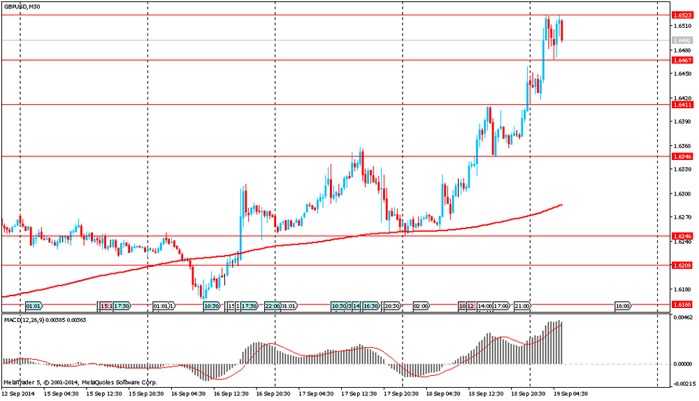 Фунт вырос более чем на 0,5% против всех основных валют после оглашения предварительных результатов по референдуму о независимости Шотландии. Клакманнаншир стала первой из 32 областей Шотландии, сообщившей результаты референдума о независимости Шотландии. Избиратели поддержали сохранение союза: 54% голосов «против» независимости, 46% «за». Позднее стало известно, что 4 из 32 избирательных округов в Шотландии проголосовали против независимости. Окончательные результаты станут известны приблизительно в 7 утра по местному времени.
