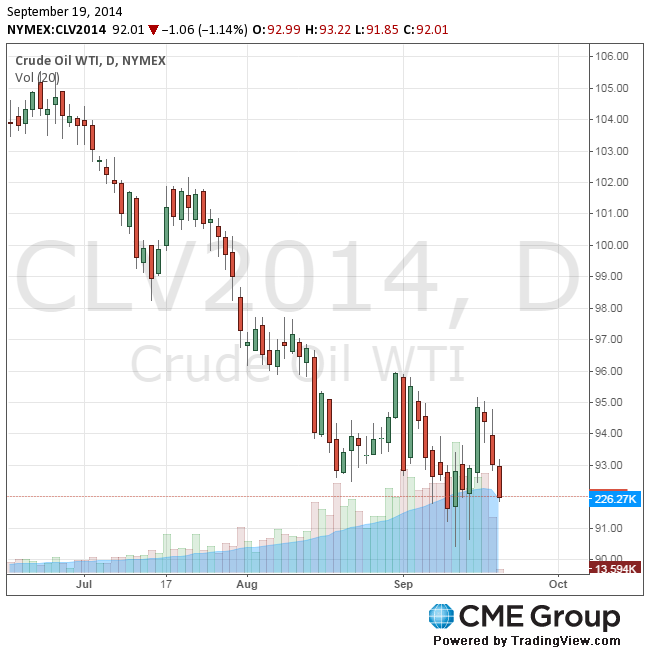 Стоимость октябрьских фьючерсов на американскую легкую нефть марки WTI (Light Sweet Crude Oil) снизилась до $91.85 за баррель на Нью-йоркской товарной бирже (NYMEX).