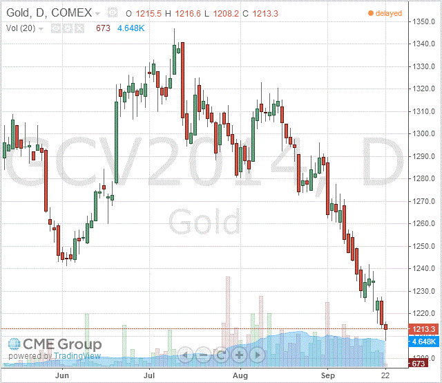 Стоимость октябрьского фьючерса на золото на COMEX сегодня упала до 1213.30 долларов за унцию.