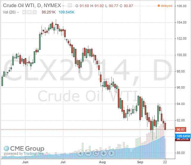 Стоимость ноябрьских фьючерсов на американскую легкую нефть марки WTI (Light Sweet Crude Oil) снизилась до $90.87 за баррель на Нью-йоркской товарной бирже (NYMEX).