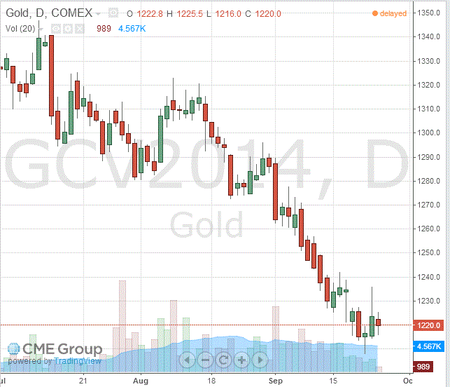 Стоимость октябрьского фьючерса на золото на COMEX сегодня упала до 1220.00 долларов за унцию.