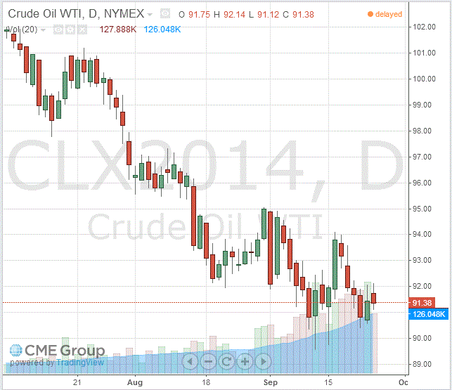 Стоимость ноябрьских фьючерсов на американскую легкую нефть марки WTI (Light Sweet Crude Oil) упала до $91.38 за баррель на Нью-йоркской товарной бирже (NYMEX).