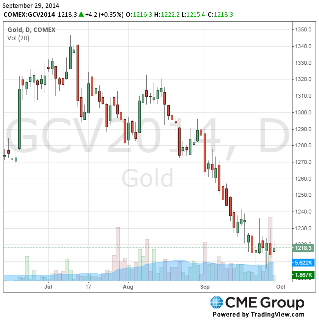 Стоимость октябрьского фьючерса на золото на COMEX сегодня выросла до 1222.20 долларов за унцию.
