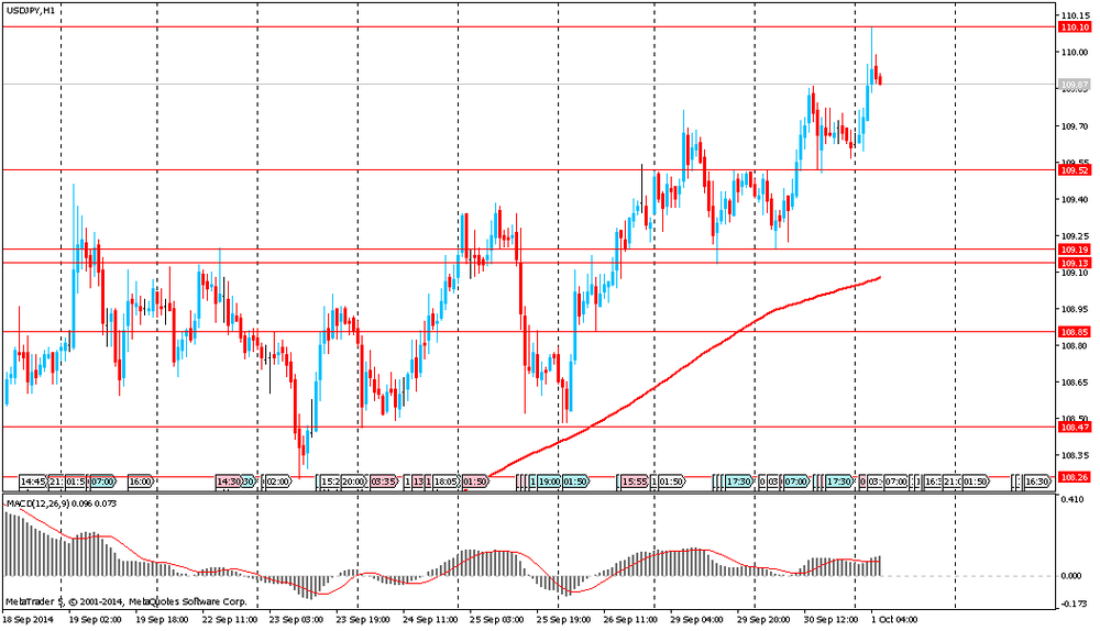 Доллар вырос против иены выше уровня Y110 впервые с 2008 года в преддверии выхода статданных по занятости в США. Согласно среднему прогнозу экономистов, сегодняшние данные от исследовательского института ADP в Розеленде, Нью-Джерси, число занятого населения в сентябре увеличится, вероятно, на 206 тыс человек, что выше показателя августовского подъема на 204 тыс. Помимо этого, 3 октября рынок ожидает публикации официальных данных по безработице от Министерства занятости США. Аналитики прогнозируют, что число занятых в несельскохозяйственных отраслях экономики выросло в сентябре на 216 тыс. Такие позитивные ожидания подталкивают чиновников из ФРС к скорому сокращению стимулирующих программ и повышению учетной ставки в ближайшем будущем (2015 г.).