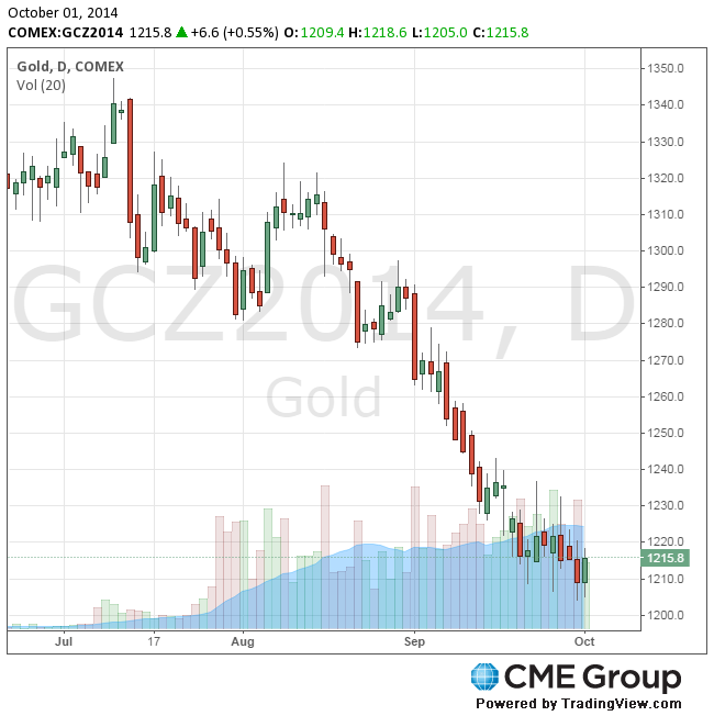 Стоимость октябрьского фьючерса на золото на COMEX сегодня выросла до 1218.60 долларов за унцию.