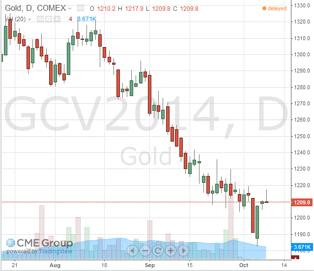 Стоимость декабрьского фьючерса на золото на COMEX сегодня выросла до 1209.80 долларов за унцию.
