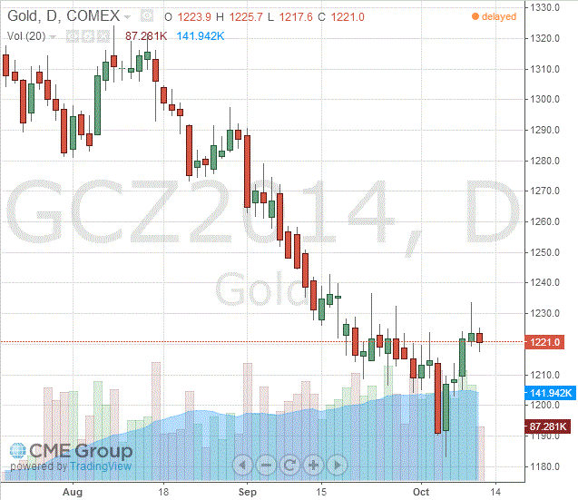 Стоимость декабрьского фьючерса на золото на COMEX сегодня упала до 1221.00 долларов за унцию.