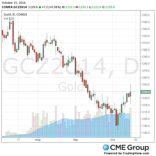Поддержку ценам на золото также дают пессимистичные новости из Европы: правительство Германии существенно снизило прогнозы экономического роста на 2014-2015 годы, индекс делового климата в стране впервые с ноября 2012 года упал ниже нуля, а промышленное производство в еврозоне сократилось в августе.