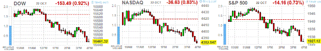Участники рынка следили и за ситуацией на рынке нефти. Стоимость нефти заметно снизилась, что было связано с выходом отчета по запасам нефти. Министерство энергетики США сообщило, что коммерческие запасы нефти на неделе 11 - 17 октября выросли на 7,1 млн баррелей до 377,7 млн баррелей, тогда как средний прогноз предполагал рост на 3,1 млн баррелей. Запасы выросли до максимума с 4 июля. Запасы нефти в терминале Кушинга выросли на 953 000 баррелей до 20,6 млн баррелей.