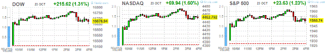 Фондовые индексы США подскочили, оправившись от вчерашней отрицательной динамики, так как доходы компаний Caterpillar Inc (САТ) и 3М Со (МММ) превысили ожидания аналитиков, а также из-за данных по росту европейской экономики.