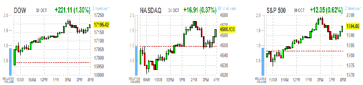 Основные фондовые индексы США завершили торги в плюсе. Экономика США выросла больше прогноза в третьем квартале, подтвердив оптимизм, побудивший Федеральную резервную систему прекратить закачивать деньги в финансовые рынки.