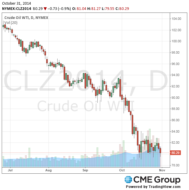 Стоимость декабрьских фьючерсов на американскую легкую нефть марки WTI (Light Sweet Crude Oil) снизилась до $79,55 за баррель на Нью-йоркской товарной бирже (NYMEX).