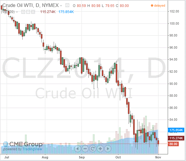 Стоимость декабрьских фьючерсов на американскую легкую нефть марки WTI (Light Sweet Crude Oil) снизилась до $80,00 за баррель на Нью-йоркской товарной бирже (NYMEX).