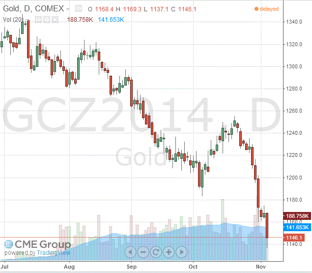 Стоимость декабрьского фьючерса на золото на COMEX сегодня упала до 1146.10 долларов за унцию.
