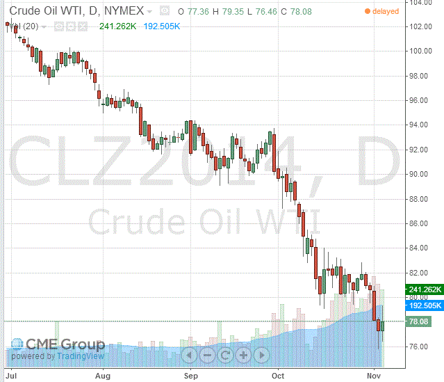 Нефтяные фьючерсы подорожали сегодня, отступив при этом от четырехлетнего минимума, так как положительные данные по рынку труда США компенсировали негатив от китайских отчетов. Напомним, рост производственных и непроизводственных отраслей китайской промышленности замедлился в октябре, показали индексы PMI, рассчитанные HSBC/Markit. Между тем, стало известно: занятость в частном секторе выросла на 230 000 рабочих мест с сентября по октябрь. Ожидалось, что показатель увеличится на 214 тыс.