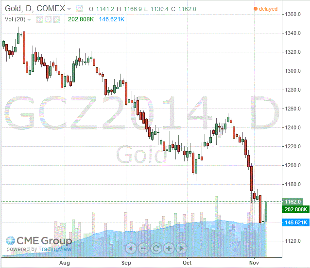 Стоимость декабрьского фьючерса на золото на COMEX сегодня выросла до 1162.00 долларов за унцию.