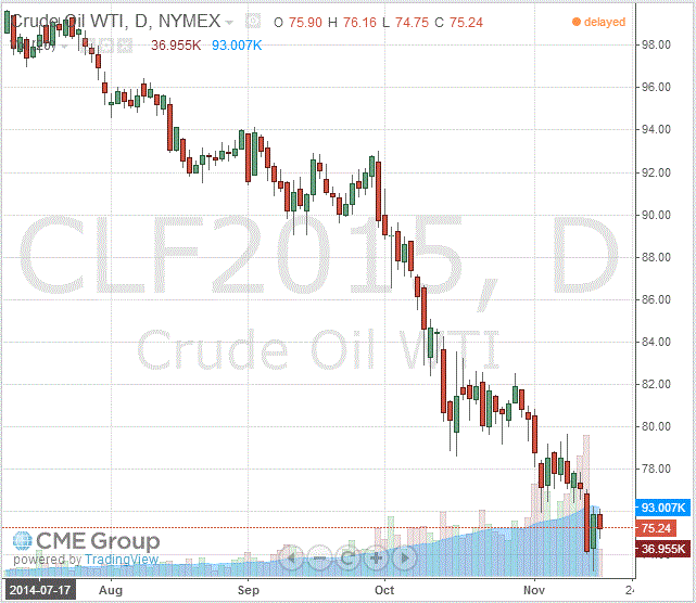 В центре внимания инвесторов также остается ситуация в государствах ОПЕК, представители которых в последние дни активизировали переговоры в преддверии заседания 27 ноября. Министры нефти Саудовской Аравии и Кувейта выступают против сокращения производства, в то время как Ливия, Венесуэла и Эквадор настаивают на принятии мер по предотвращению дальнейшего падения цен. Эксперты отмечают, что резкое снижение квот на добычу нефти, способное нормализовать баланс спроса и предложения и стабилизировать цены, представляется маловероятным. В JPMorgan считают, что цена нефти может опуститься до 70 долларов за баррель и даже коснуться уровня в 65 долларов в начале января следующего года. Такое падение цен на нефть произойдет, если на ноябрьском заседании ОПЕК решит сократить квоты на добычу.
