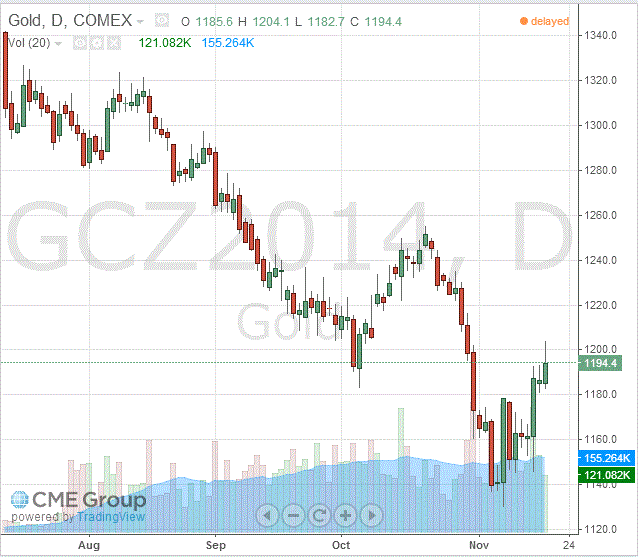 Стоимость декабрьского фьючерса на золото на COMEX сегодня выросла на $10,9 до 1194.40 долларов за унцию.