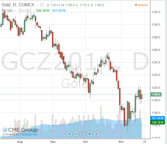 Стоимость декабрьского фьючерса на золото на COMEX сегодня выросла до 1189.60 долларов за унцию.