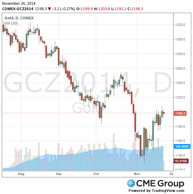 Стоимость декабрьского фьючерса на золото на COMEX сегодня упала до $1192,20 за унцию.