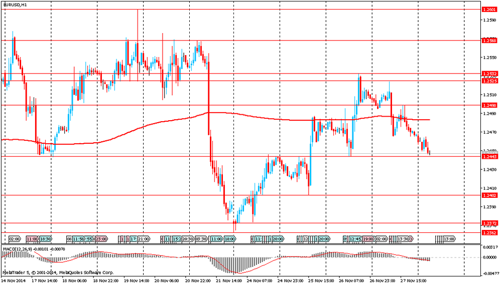 Евро упал в ожидание выхода предварительных данных по инфляции в еврозоне за ноябрь. Согласно средним прогнозам экономистов, показатель в ноябре вырос на 0,3% по сравнению с +0,4% в предыдущем месяце. Стоит отметить, с 2011 года темпы инфляции по сравнению с аналогичным периодом предыдущего года были ниже тренда, а с октября 2013 года индекс потребительских цен упал ниже 1%, что заметно меньше целевого значения ЕЦБ "около 2%". Слабость банковского кредитования была одной из причин падения потребительских цен, поэтому ЕЦБ и начал борьбу с этой проблемой. Первый старт программы стимулирования был отмечен в сентябре, но до сих пор это не оказало заметного влияния на инфляцию. Напомним, в октябре ИПЦ вырос по сравнению с аналогичным периодом прошлого года всего лишь на 0,4%. Таким образом, стоит ожидать от ЕЦБ более агрессивных монетарных мер.