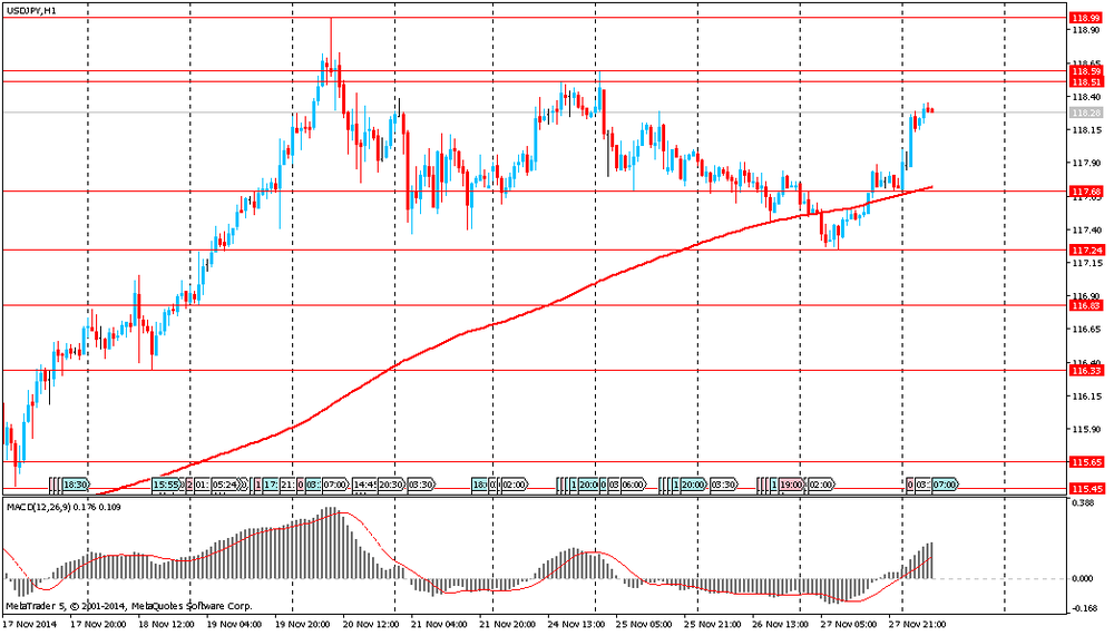 Иена упала к семилетнему минимуму на фоне выхода негативных макроэкономических данных. В октябре базовый индекс потребительских цен Японии с учетом коррекции на повышение налога с продаж до 8% с 5% в апреле вырос на 0,9% по сравнению с аналогичным периодом предыдущего года после роста на 1,0% в прошлом месяце. Это самое низкое значение показателя за год; оно отражает снижение цен на нефть и слабый внутренний спрос. Помимо этого, в сентябре розничные продажи упали на 1,4% тогда как экономисты ожидали снижения всего на 0,5%.