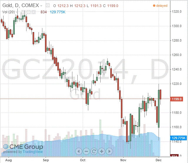 Стоимость январского фьючерса на золото на COMEX сегодня упала до 1199.00 долларов за унцию.