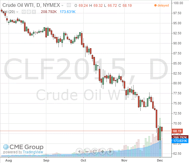 Напомним, 27 ноября в Вене прошел саммит Организации стран-экспортёров нефти. Картель принял решение сохранить текущие объемы добычи нефти в 30 миллионов баррелей в день до июня 2015 года, что подтолкнуло рынки к продолжению снижения цен.