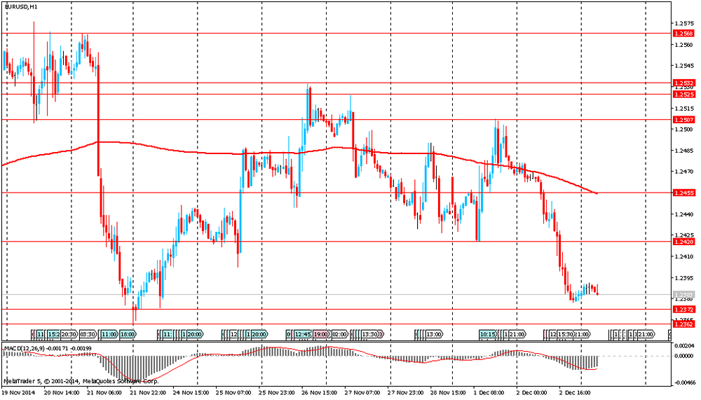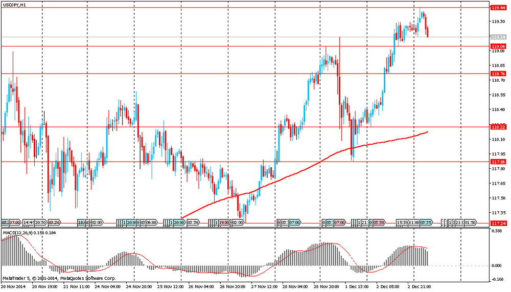 Индекс доллара вырос и достиг семилетнего максимума против иены в ожидание сегодняшнего выхода данных по занятости в США. Согласно среднему прогнозу экономистов, число занятых от агентства ADP составит в ноябре 223 тыс, против 230 тыс в октябре. Кроме того, 5 декабря Министерство труда США предоставит свой отчет по занятости. Напомним, в США расходы на строительство выросли больше, чем ожидалось в октябре; при этом как частные, так и государственные расходов увеличились, что может снизить опасения резкого замедления экономического роста в четвертом квартале.