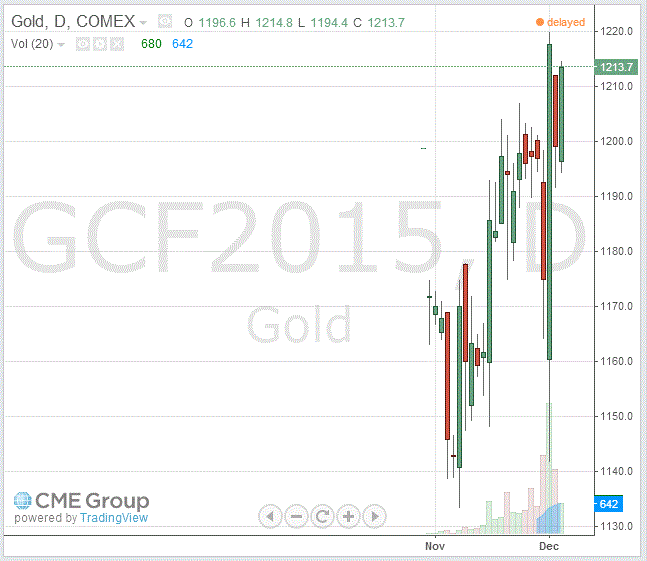 Стоимость январского фьючерса на золото на COMEX сегодня выросла на $14.5 до 1213.70 долларов за унцию.