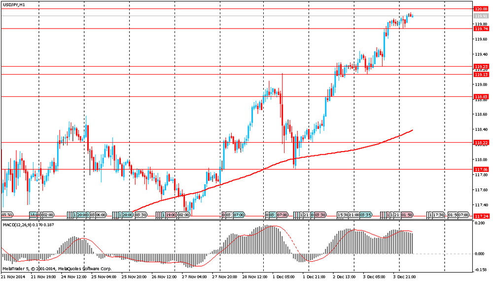 Доллар вырос против иены, приблизившись к уровню Y120 (самому высокому уровню с июля 2007 года) в ожидании позитивного отчета по занятости в США, запланированного на пятницу. Согласно среднему прогнозу экономистов, 5 декабря Министерство труда США отчитается о росте числа занятых в ноябре на 225 тыс против 214 тыс в октябре. Напомним, вчера в соответствии с ноябрьским отчетом по занятости от ADP показатель в частном секторе увеличился на 208 тыс рабочих мест с октября по ноябрь. "Данные за ноябрь по-прежнему показывают устойчивый рост рабочих мест свыше 200 000", сказал Карлос Родригес, президент и главный исполнительный директор ADP. "Малые предприятия продолжали наращивать численность персонала, добавив почти половину общей занятости в течение месяца".