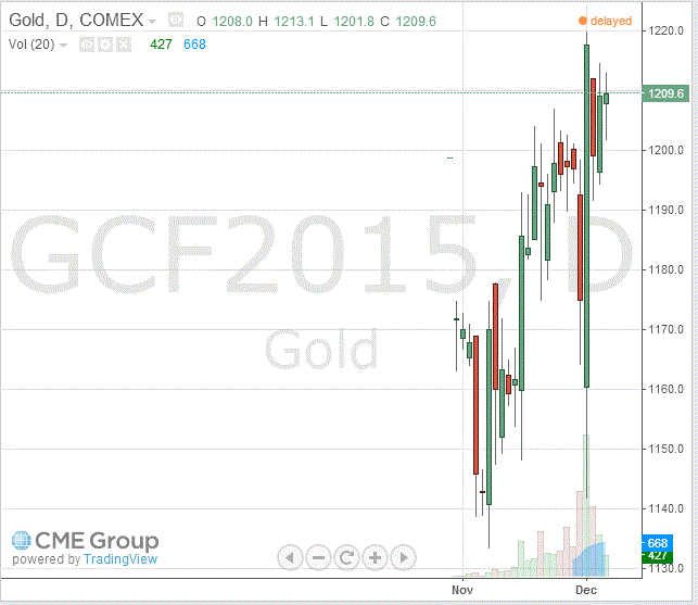 Стоимость январского фьючерса на золото на COMEX сегодня выросла на $1.1 - до 1209.60 долларов за унцию.