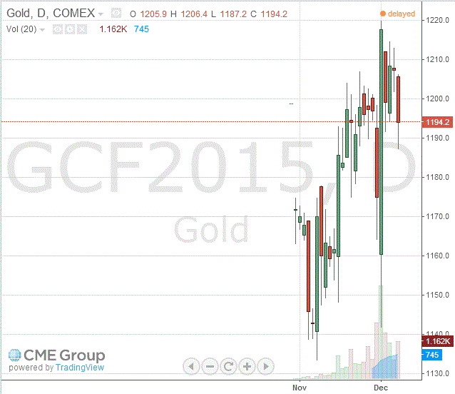 Стоимость январского фьючерса на золото на COMEX сегодня упала на $12.8 до 1194.20 долларов за унцию.